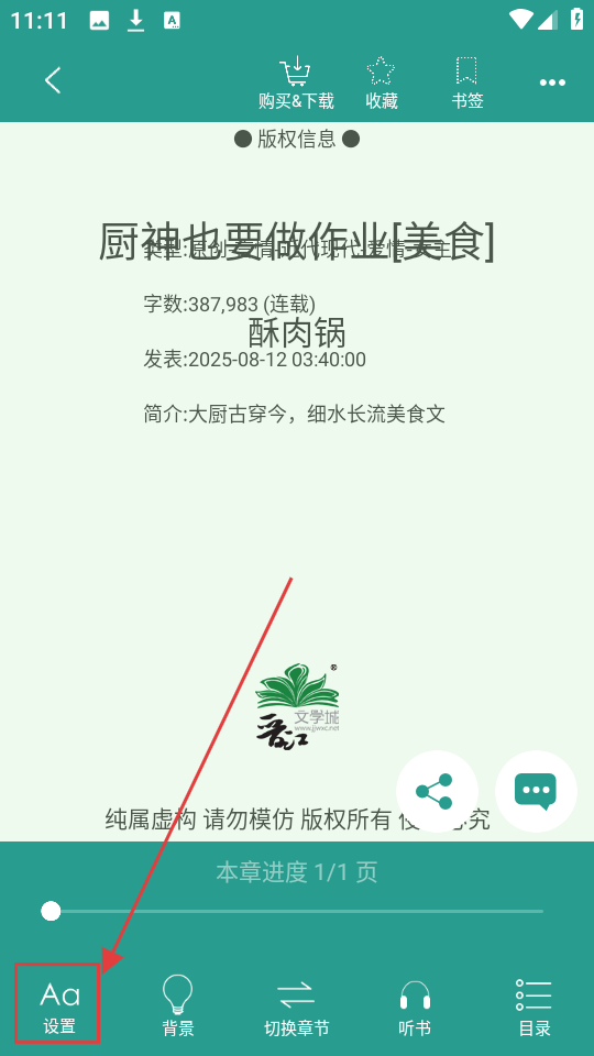 2、进入阅读页后,若要调整阅读设置,点击【设置】按钮,展开设置选项。
