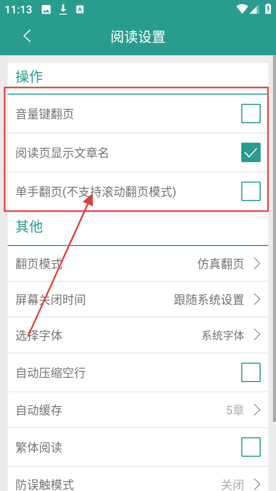 4、在阅读设置页,能设置【音量键翻页】【单手翻页】等操作选项,根据喜好勾选。