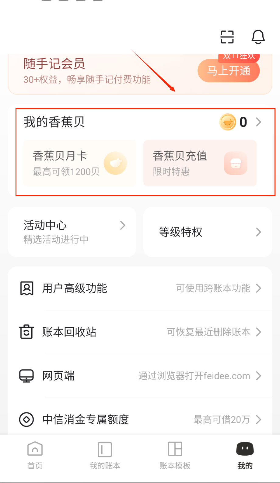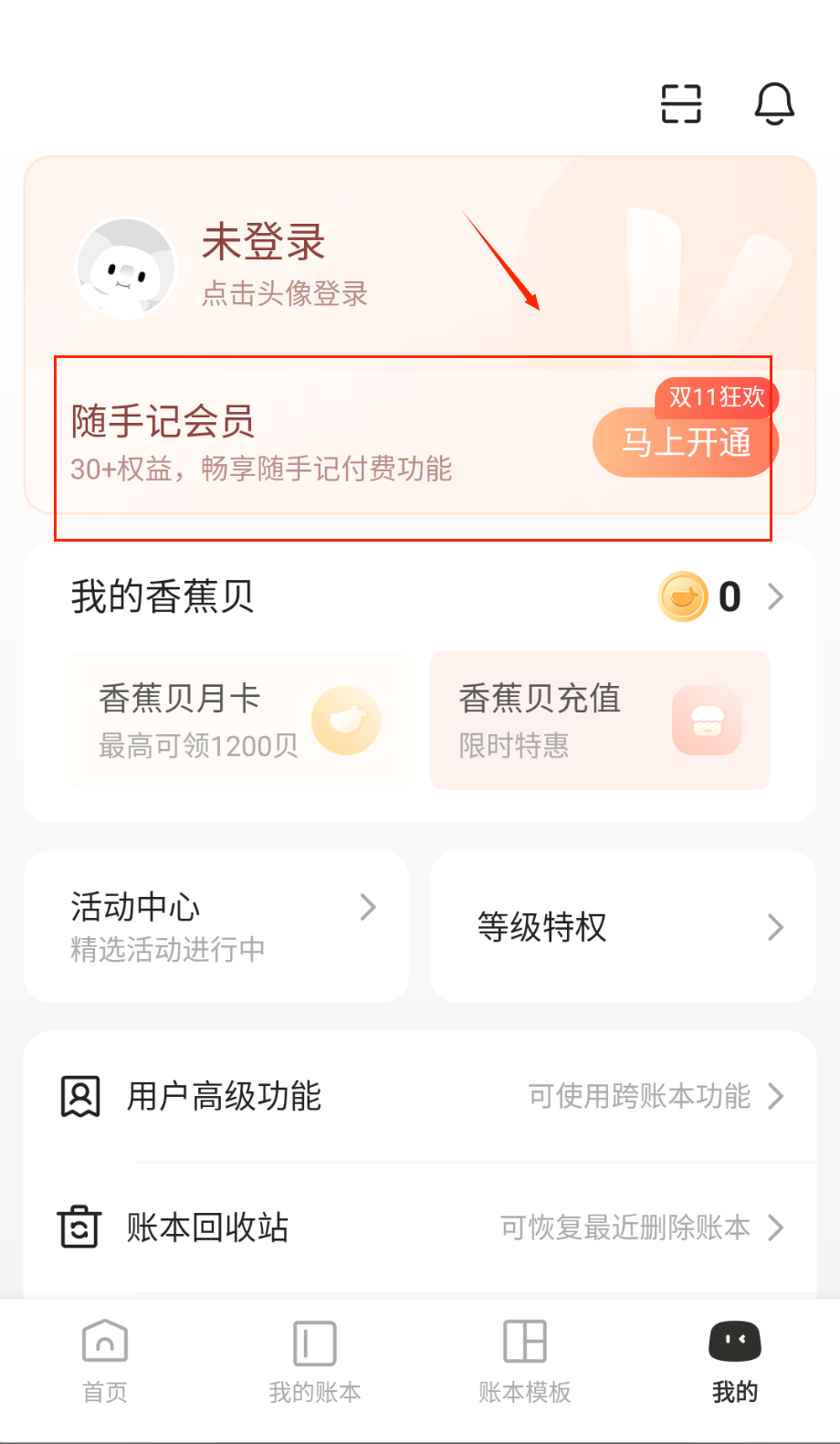 1、在"我的"页面可以看到随手记会员推广信息,开通会员能享受30多项权益比如跨账本功能等高级服务哦。