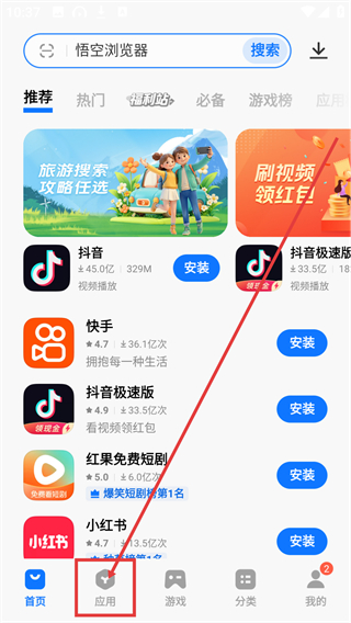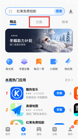 2、在应用页点击顶部的【分类】标签,就能切换到应用分类页面,按类别筛选想要的应用哦。