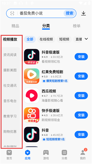 3、在分类页左侧选择【视频播放】分类,就能看到该类别下的应用列表,找到对应的视频类应用啦。