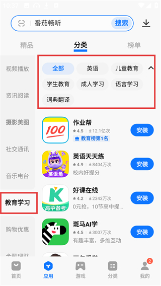 4、在分类页左侧选择【教育学习】分类,再选细分类型(比如英语),就能找到对应的学习类应用哦。