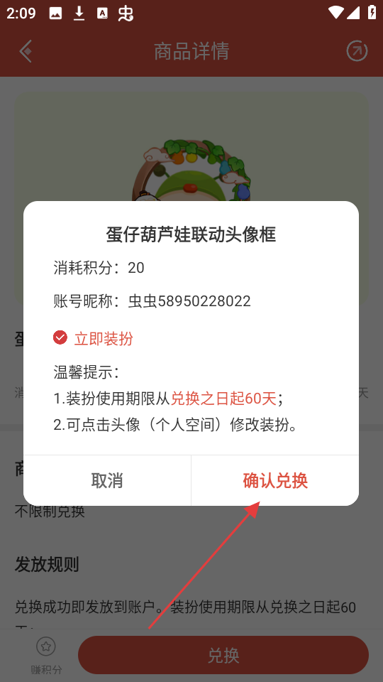 4、在兑换确认弹窗中,确认相关信息无误后,点击【确认兑换】按钮,就能成功兑换商品,还可选择立即装扮呢。