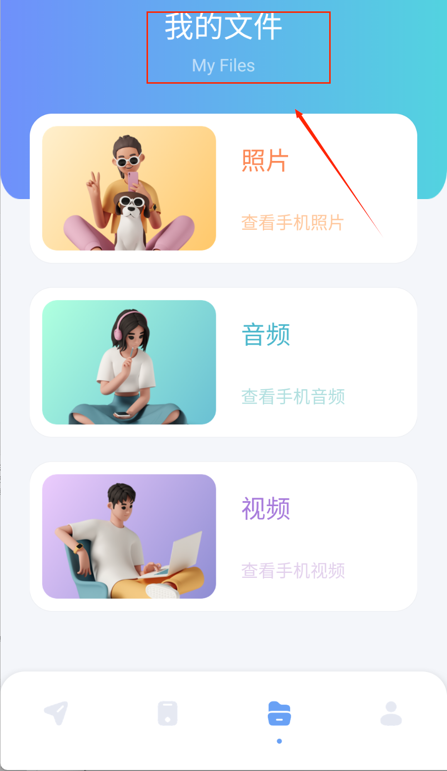 2、查看文件时,打开“我的文件”功能,界面清晰列出照片、音频和视频选项。点击任意一项,比如“音频”,就能浏览手机中的声音文件。