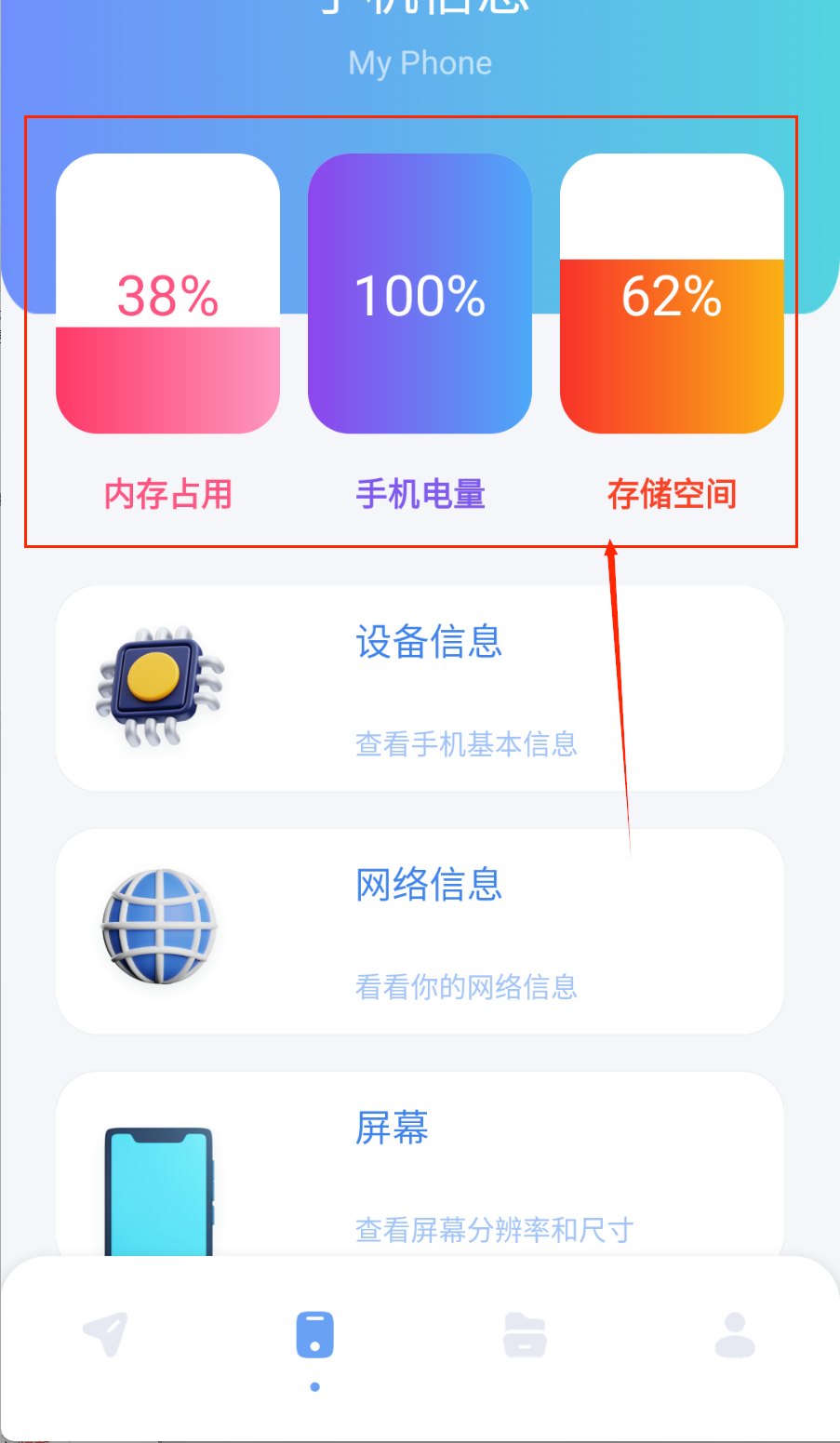 3、了解手机状态通过“手机信息”应用,启动后上方显示内存、电量和存储的百分比,如内存55%或电量100%。下方模块提供更多信息。