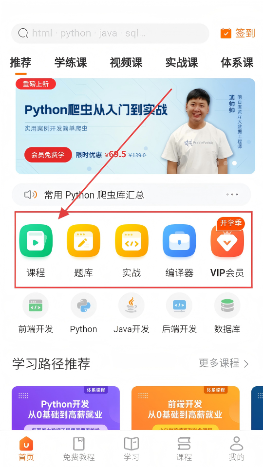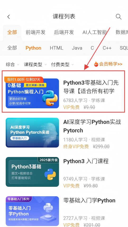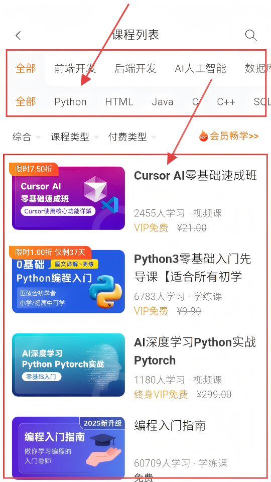 2、进入课程列表后,可根据【前端开发】【Python】等分类,筛选感兴趣的课程。