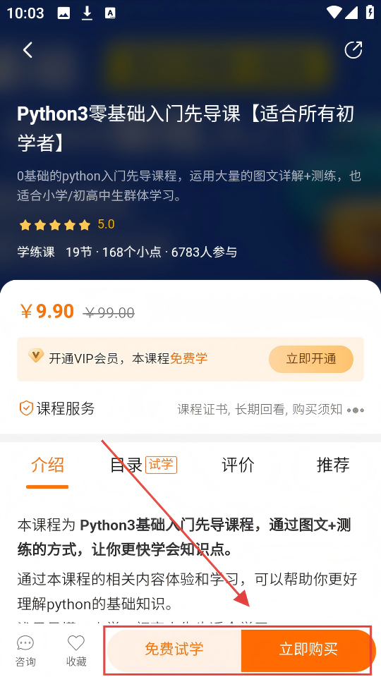 4、在课程详情页,能看到课程介绍、价格等,还可选择【免费试学】或【立即购买】。