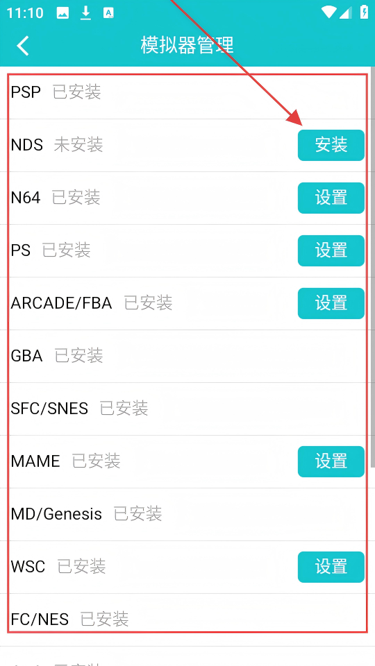 3、模拟器管理页面中,能看到PSP、NDS等模拟器,未安装的点击【安装】,已安装的可设置。