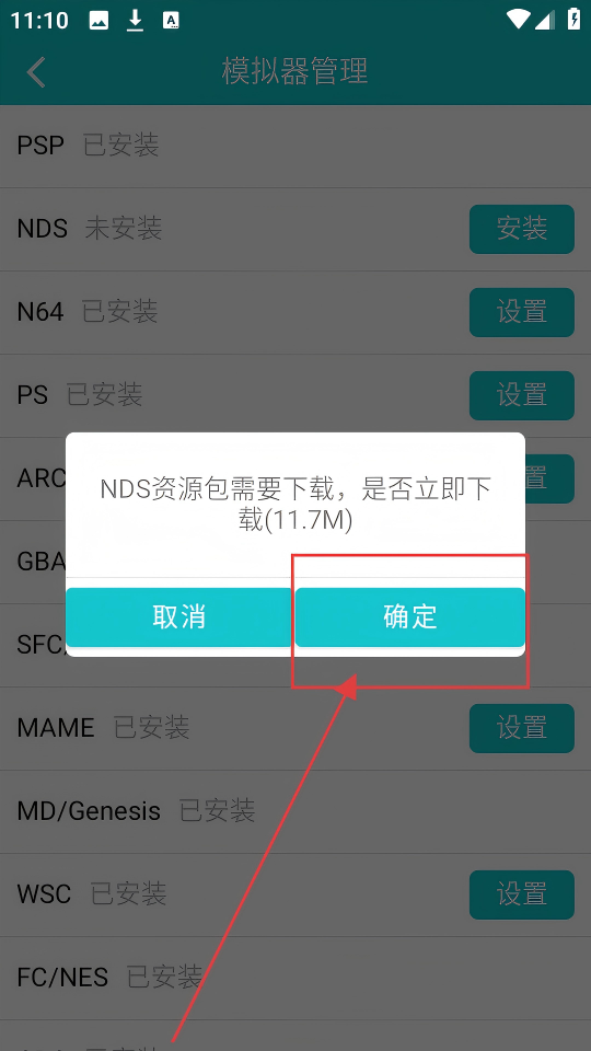 4、点击NDS模拟器的【安装】后,会弹出下载提示,点击【确定】,就能下载NDS资源包啦。