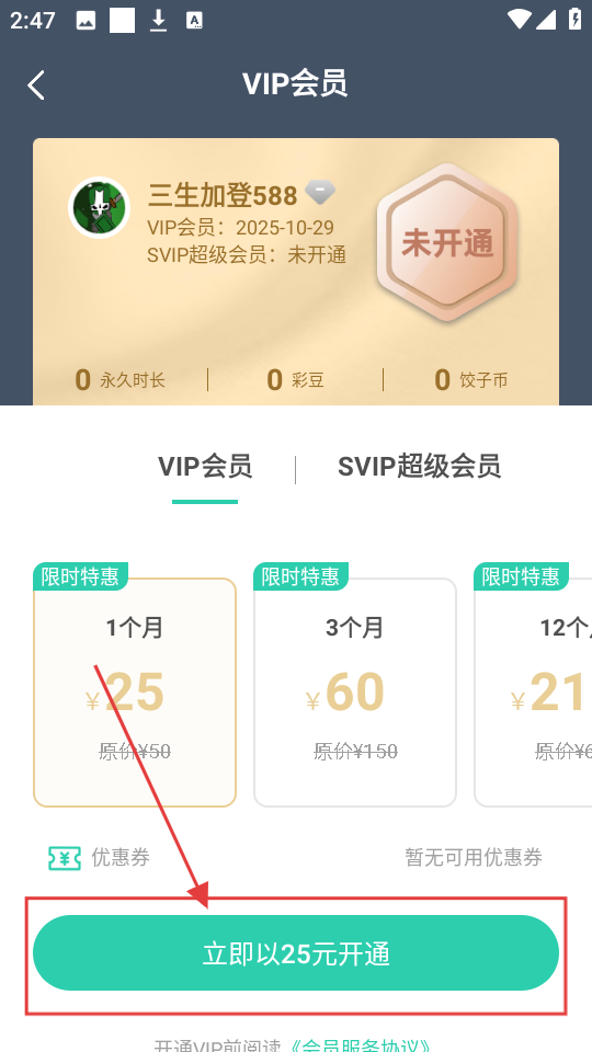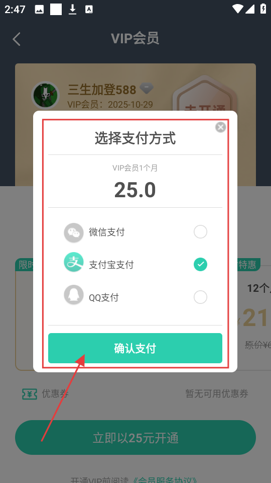 2、进入VIP会员页面后,点击【立即以25元开通】,可弹出选择支付方式弹窗,准备选择支付方式哦。