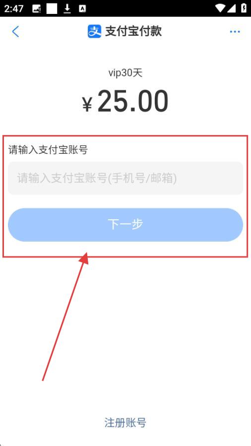 4、在支付页面,输入支付宝账号,点击【下一步】,可继续完成VIP会员的支付开通流程哦。
