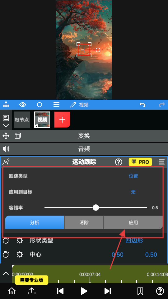 4、运动跟踪设置好后,在相关参数区域,能调整容错率等,设置好后点击【应用】,就能应用跟踪效果啦。