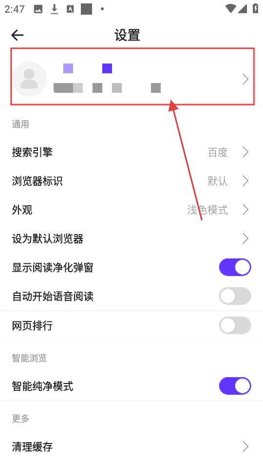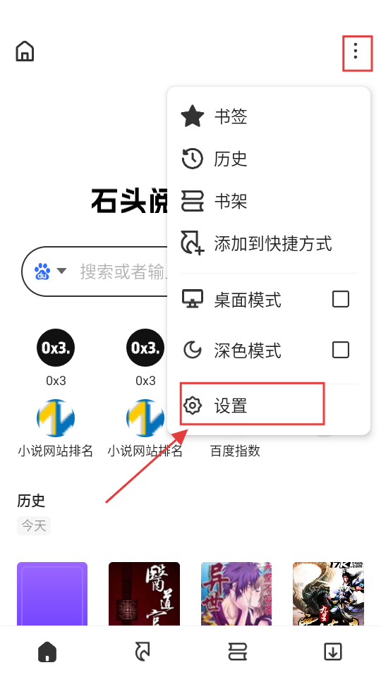 1、在石头阅读浏览器首页,点击右上角三点图标,选择【设置】,可进入设置页面啦。