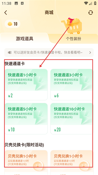 3、在商城页的游戏道具分类下,能看到【快速通道卡】等道具,按需选择对应的时长卡即可哦。