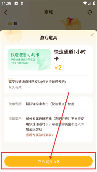 4、选中心仪的【快速通道1小时卡】后,点【立即购买¥2】按钮,就能获取该道具享受排队权益啦。