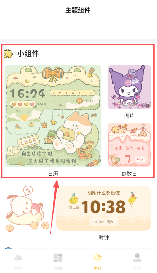 二、主题小组件让桌面独一无二。切换到“主题”页,这里提供了丰富的桌面小组件。