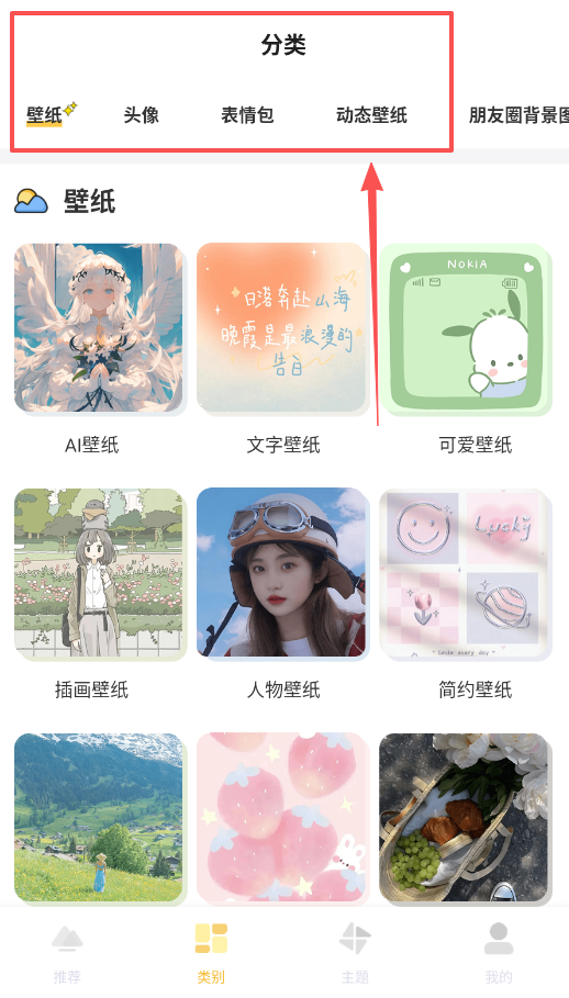 一、从分类入口探索海量素材,打开软件后点击底部“分类”,你会看到壁纸、头像、表情包等五大板块。