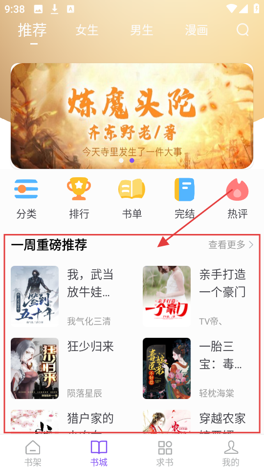 1、我们在书城的一周重磅推荐里,选择《狂少归来》,点击就能进入该书的详情页面啦。