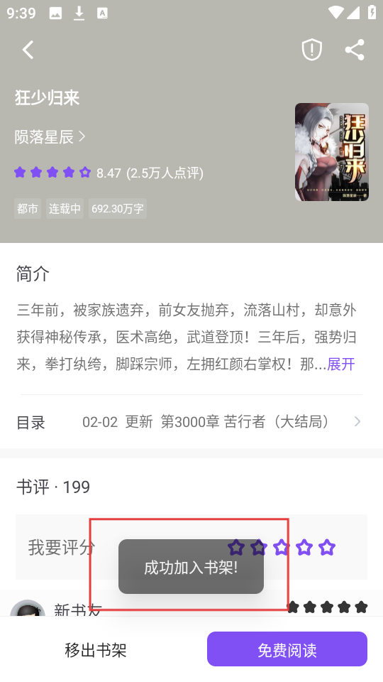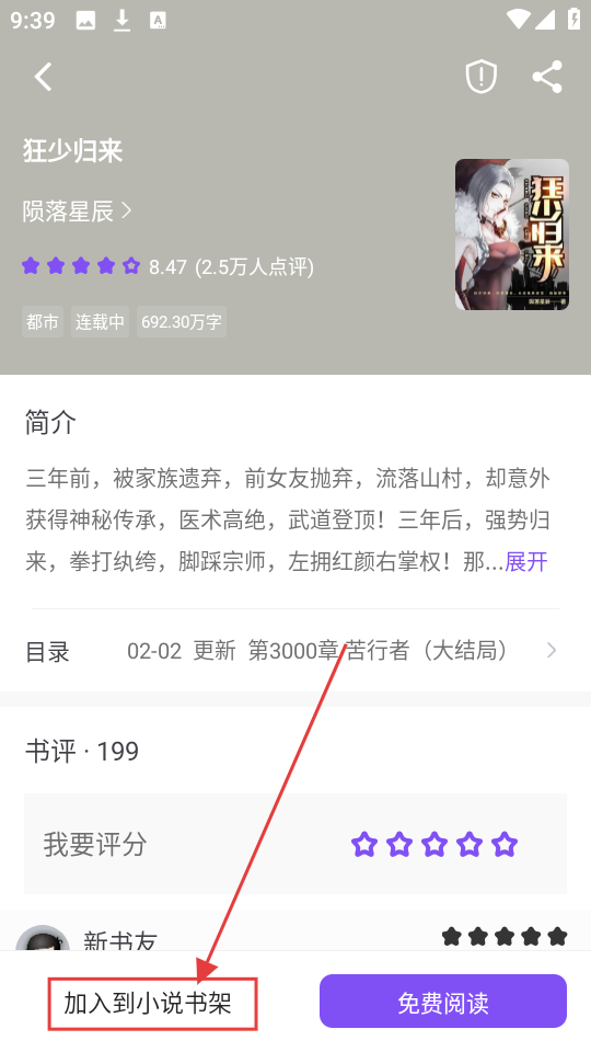 2、在《狂少归来》详情页面,点击【加入到小说书架】,就能将该书加入书架哦。