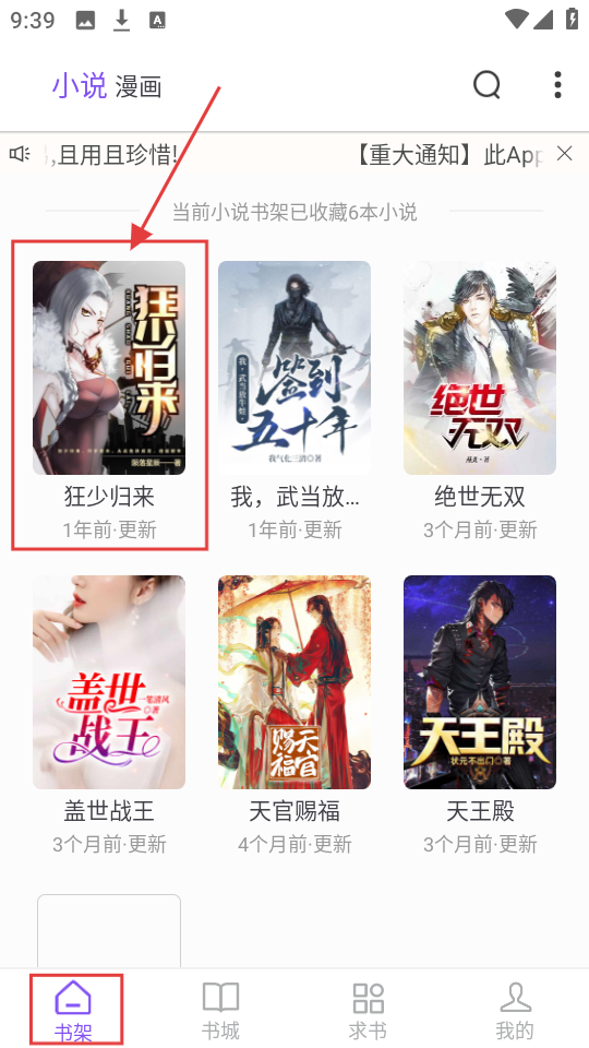 4、我们进入书架页面,就能看到《狂少归来》已在书架列表中,方便后续阅读啦。