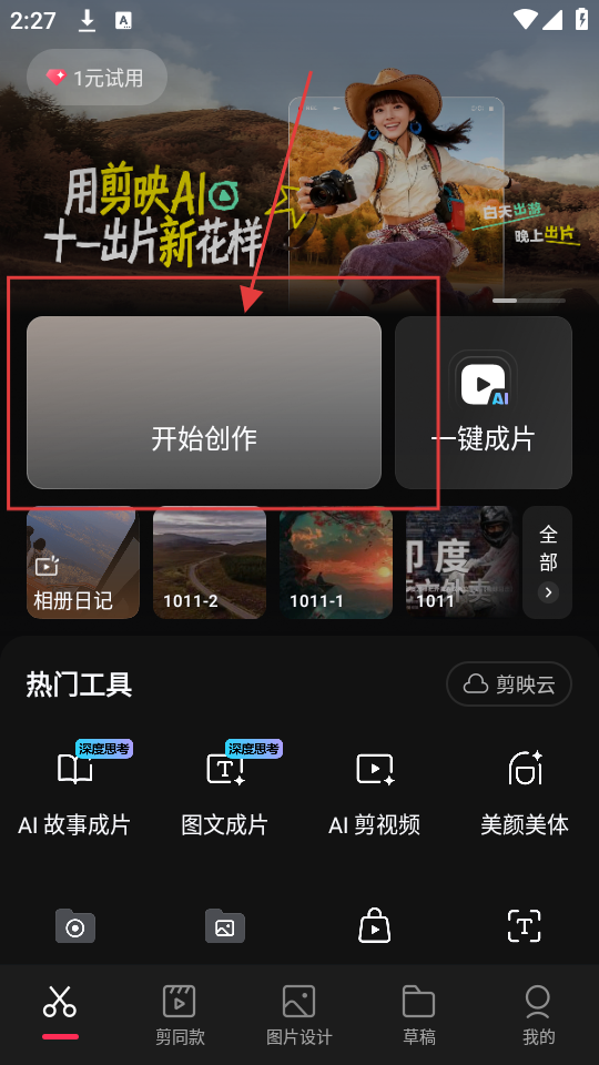 1、想要添加转场效果时打开剪映首页,然后点击“开始创作”