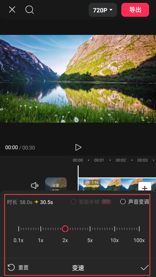4、选择好变速方式后,我们可以在速度调节栏中,设置具体的变速倍数,设置完成后,视频播放速度就会按照设定的倍数变化啦。