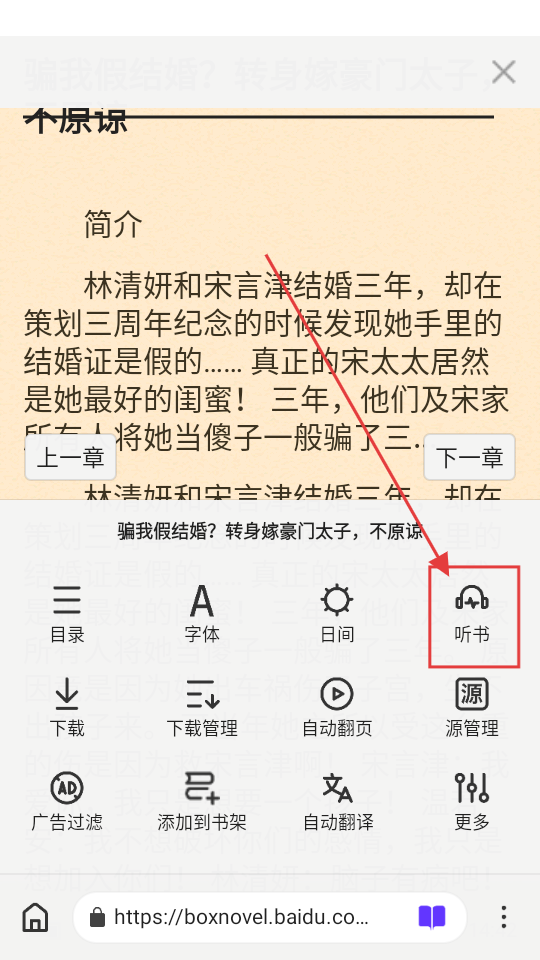 2、进入阅读页面后,点击【听书】选项,可开启听书功能哦。