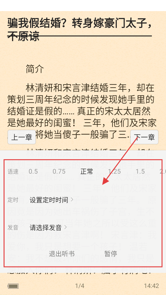 3、开启听书后,可调整语速、设置定时时间、选择发音等,让听书体验更舒适哦。