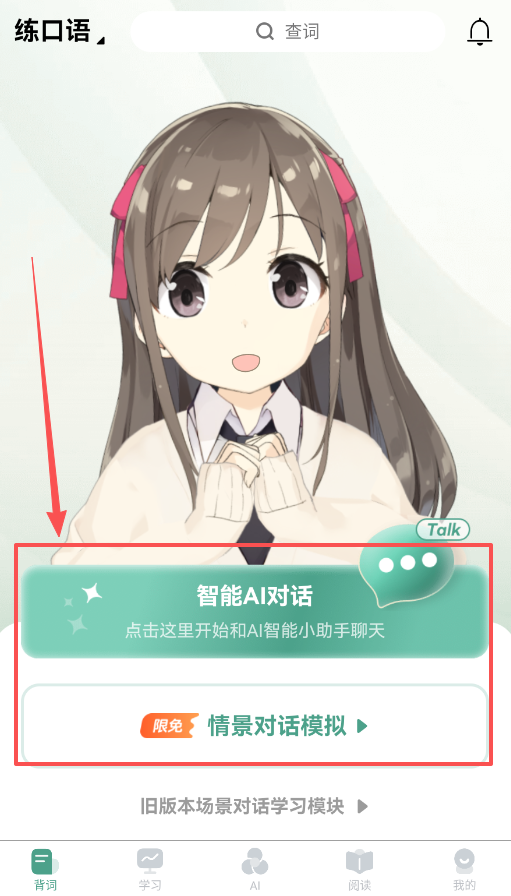 4、想练口语,就去“练口语”板块。最有趣的是“智能AI对话”,点击就能和AI小助手自由聊天。