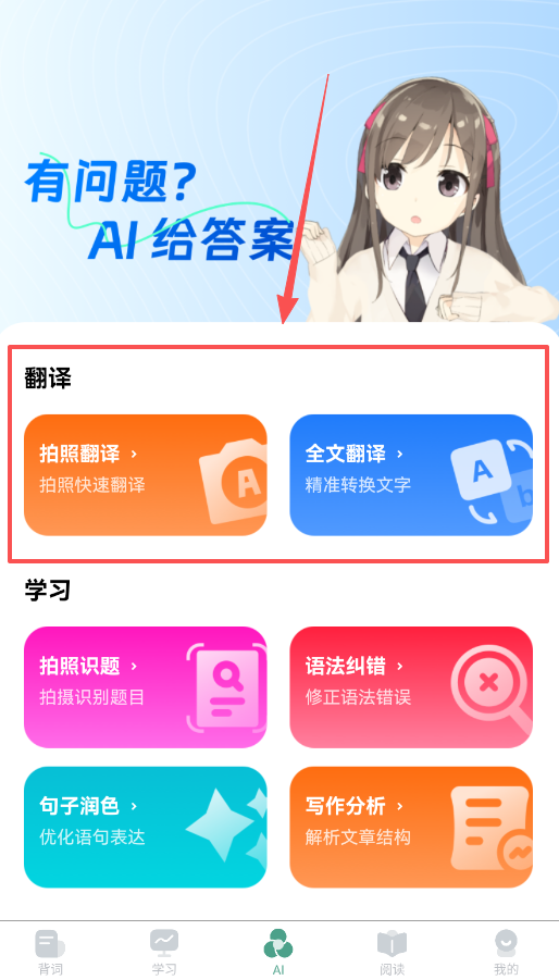 2、如果你是学生,遇到练习题或写作时,可以用“学习”模块,让表达更地道。