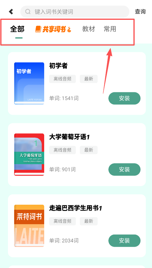 3、背单词的话,去“背词”页面,那里有很多共享词书,像“初学者”、“大学葡萄牙语1”