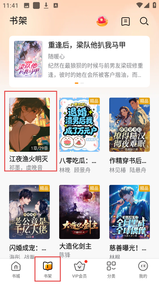 4、回到书架页面,就能看到《江夜渔火明灭》在那里,随时可以阅读哟。