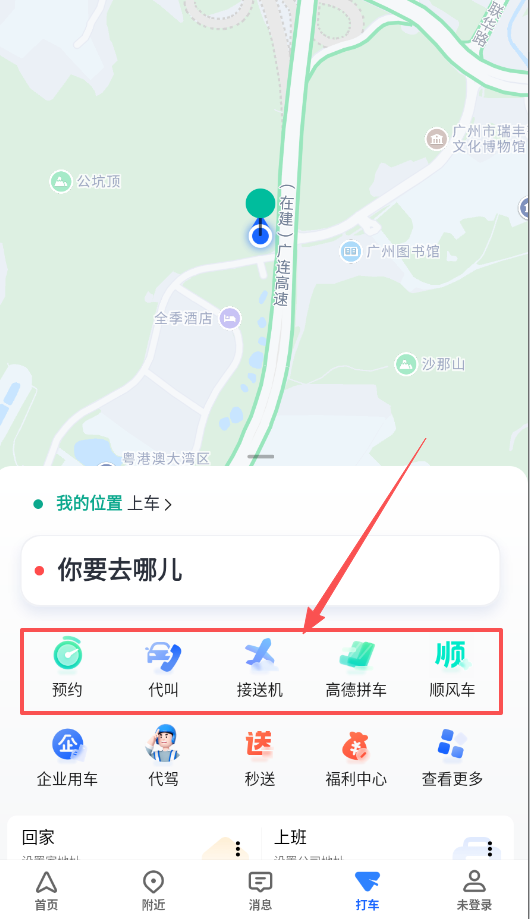 3、需要打车时,输入你的目的地,系统会同时显示实时打车拼车顺风车等多种选择,对比下价格和接驾时间。