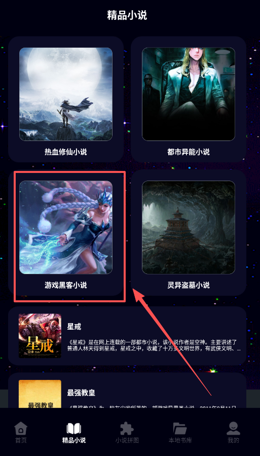 2、探索小说内容时,进入“精品小说”板块,它会以游戏黑客小说、都市异能小说等标签来划分作品,就可以阅读概要并打开正文。