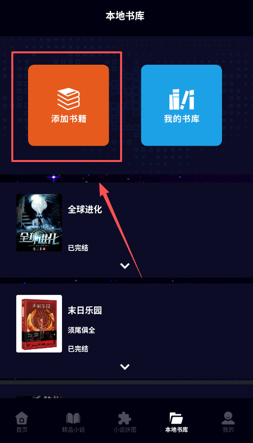 3、导入并整理你自己的书籍,需要用到“本地书库”功能,点击“添加书籍”从手机中选择文件,书库会清晰展示书名和作者信息。