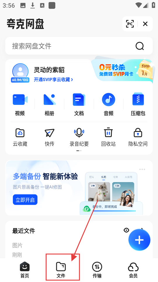 2、夸克网盘页面分类可全了,视频、文档啥的都有。要是想找文件,点底部【文件】,网盘里的文件立马就能看到哟。