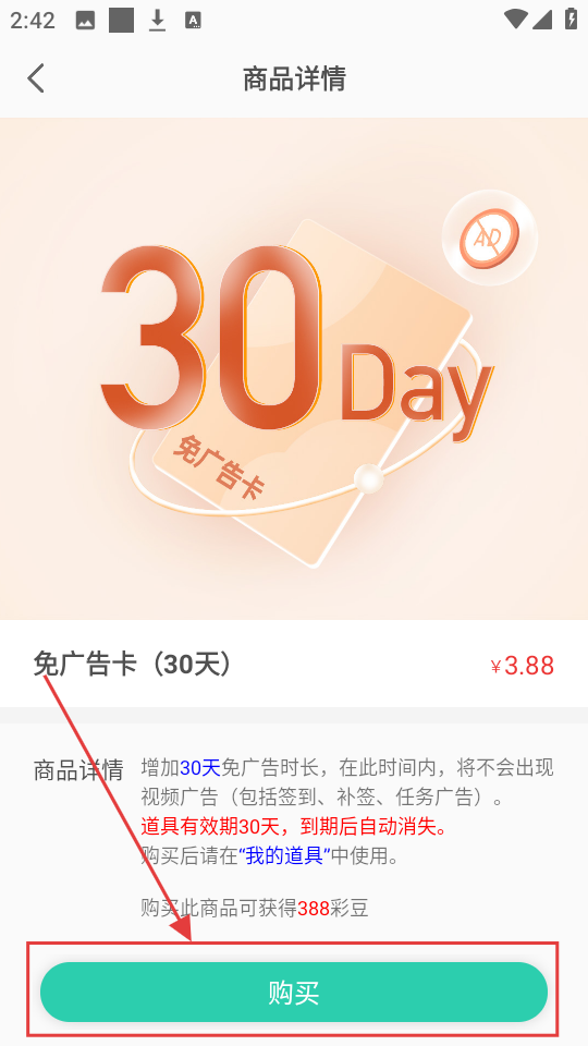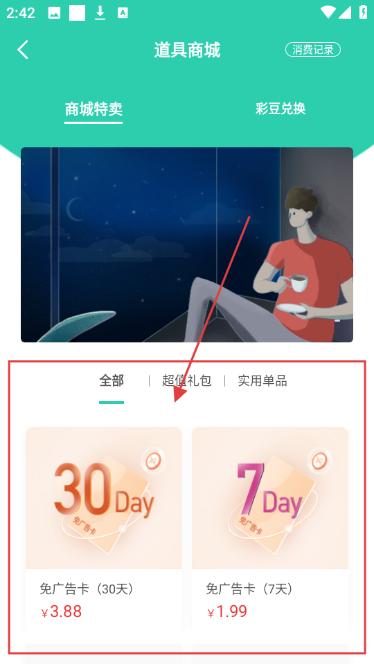 2、在【道具商城】里,能看到【免广告卡】等商品,根据需求挑选,试试吧。