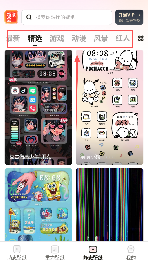 1、进入软件首页,迎面而来的是各种精选和分类内容,你可以像逛商店一样浏览“动漫”或“游戏”主题壁纸。