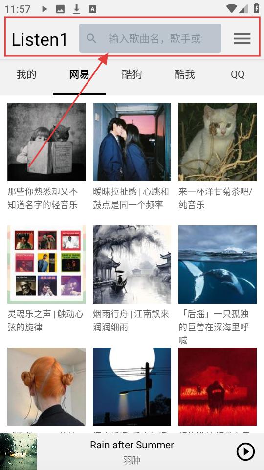 1、我们在Listen1界面,点击顶部的搜索栏,就能输入歌曲名、歌手等内容,查找想听的音乐啦。
