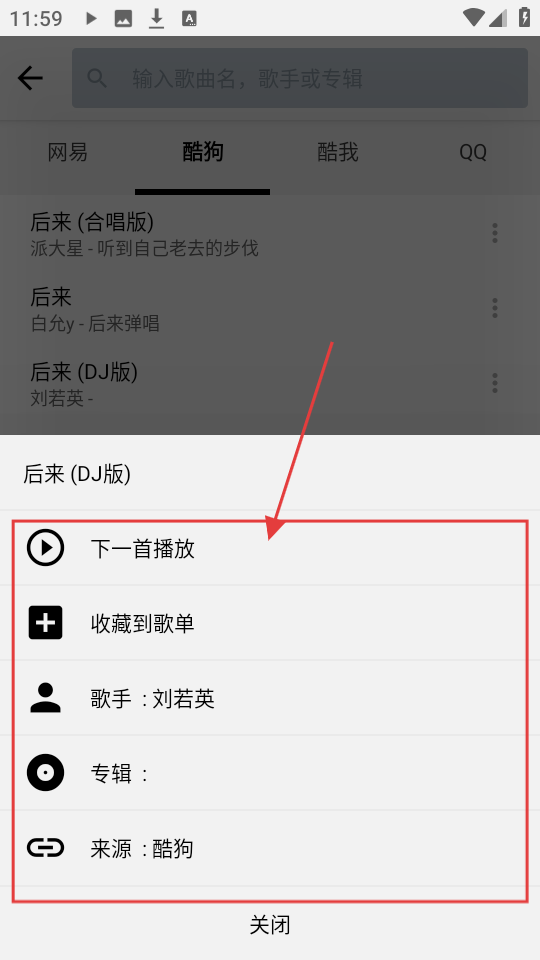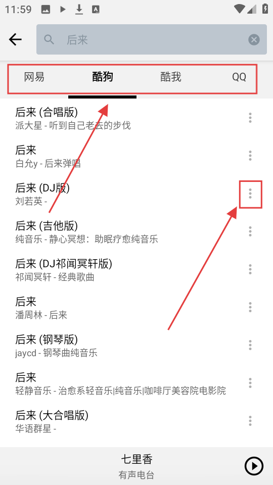 2、搜索后,在不同音乐平台标签(如网易、酷狗等)下,找到想听的歌曲,点击其右侧的三点图标。