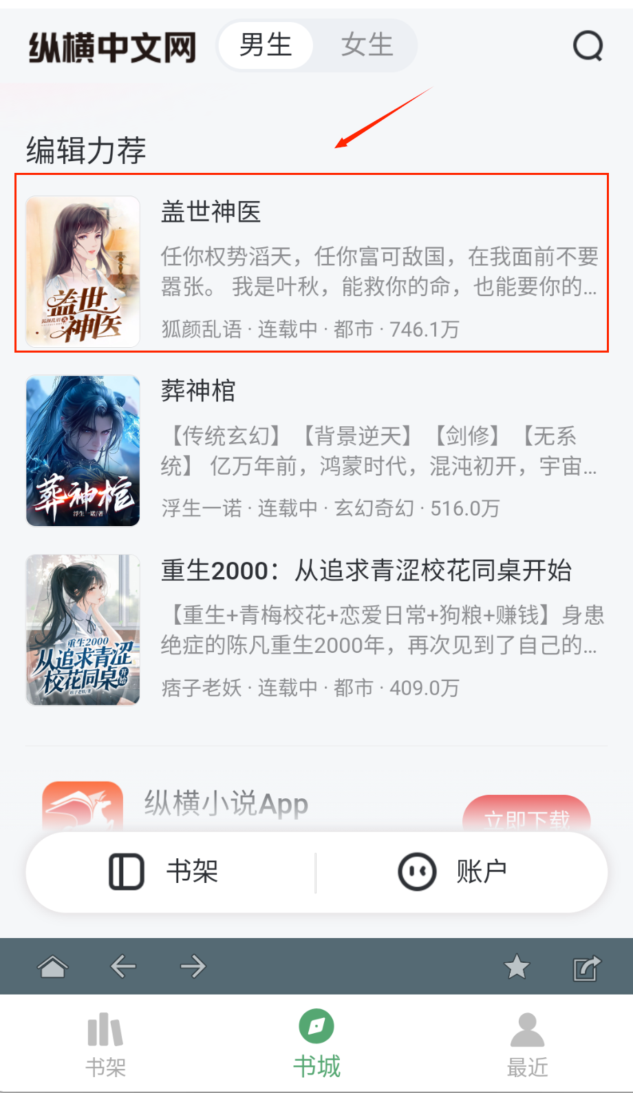 1、打开软件后先看底部三个按钮,书架是放自己收藏的书,书城能找新书,最近记录看过的书,点书城开始找书最方便啦。