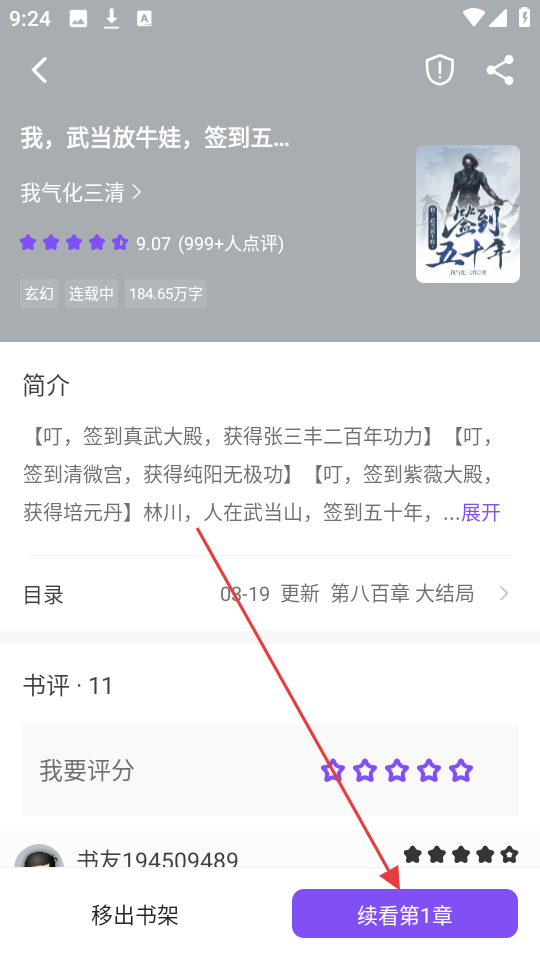 1、我们找到感兴趣的小进入小说详情页,点击【续看第1章】,就能进入阅读页面啦。