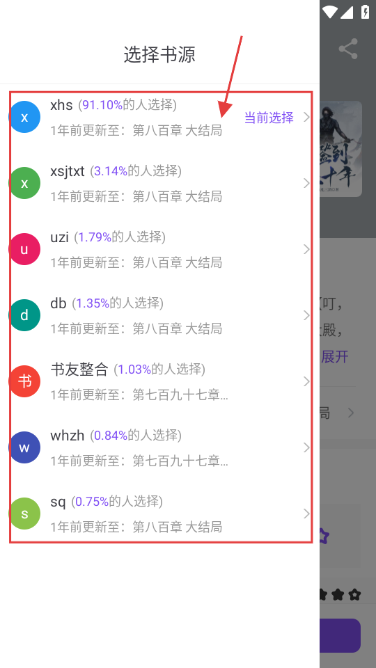 2、进入阅读页面后,可选择书源,比如xhs等,选择后就能加载对应的书源内容哦。