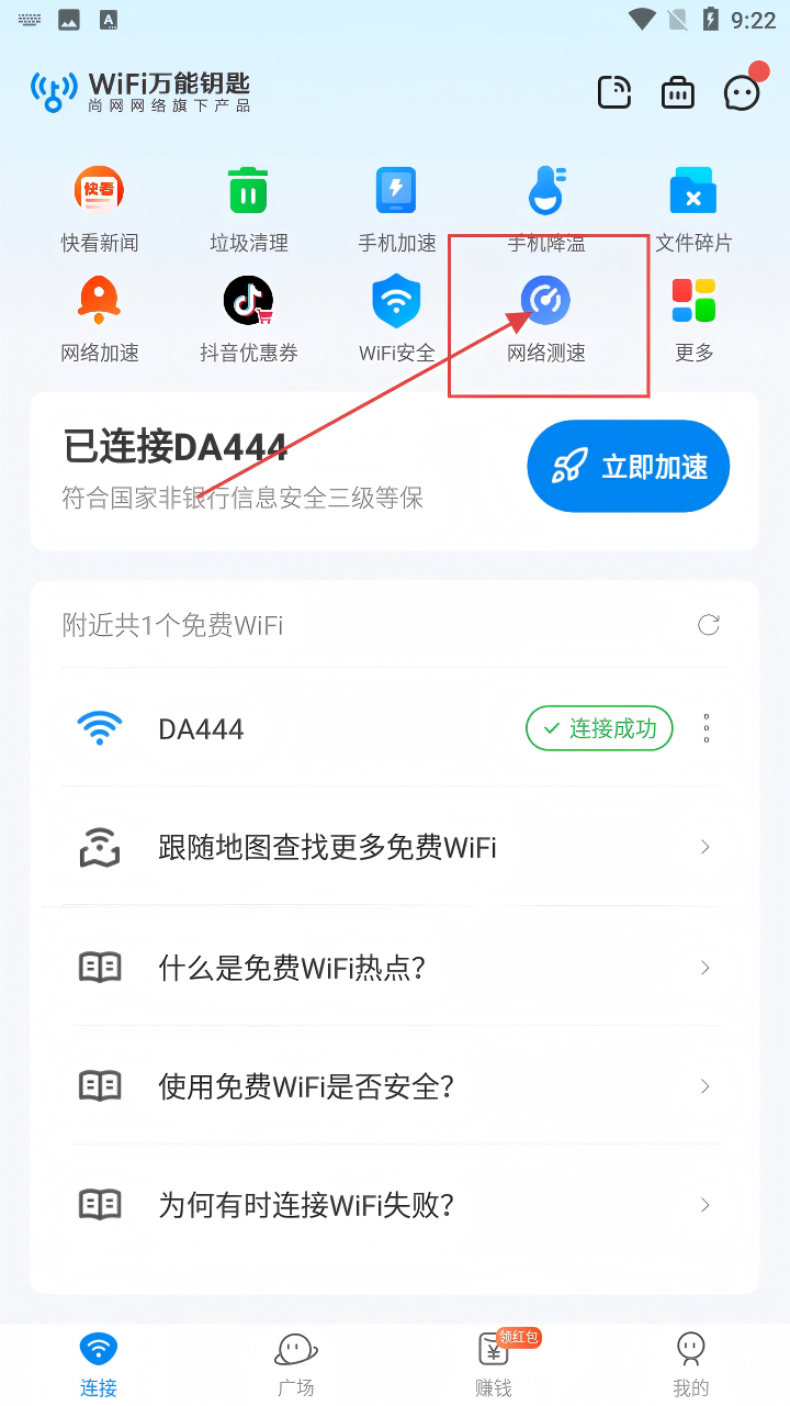 1、在WiFi万能钥匙主界面,找到【网络测速】功能入口并点击,就能开始测速流程啦。