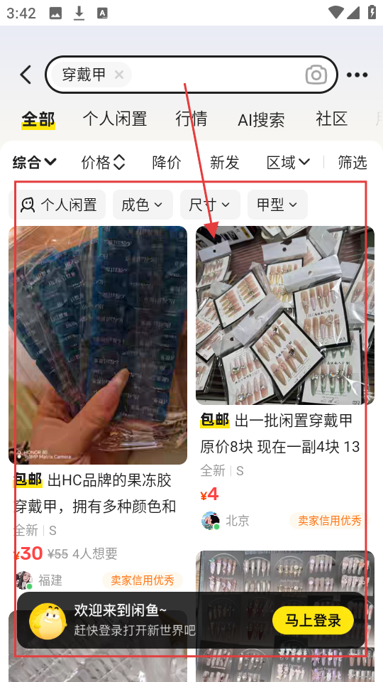1、想找心仪商品,就在顶部搜索框输入关键词,比如【穿戴甲】,点击搜索,就能看到相关商品啦。