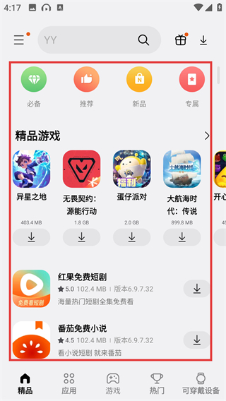 1、在应用商店的精品页找到【红果免费短剧】,它是102.4-MB的视频类应用,可点击进入详情页了解哦。