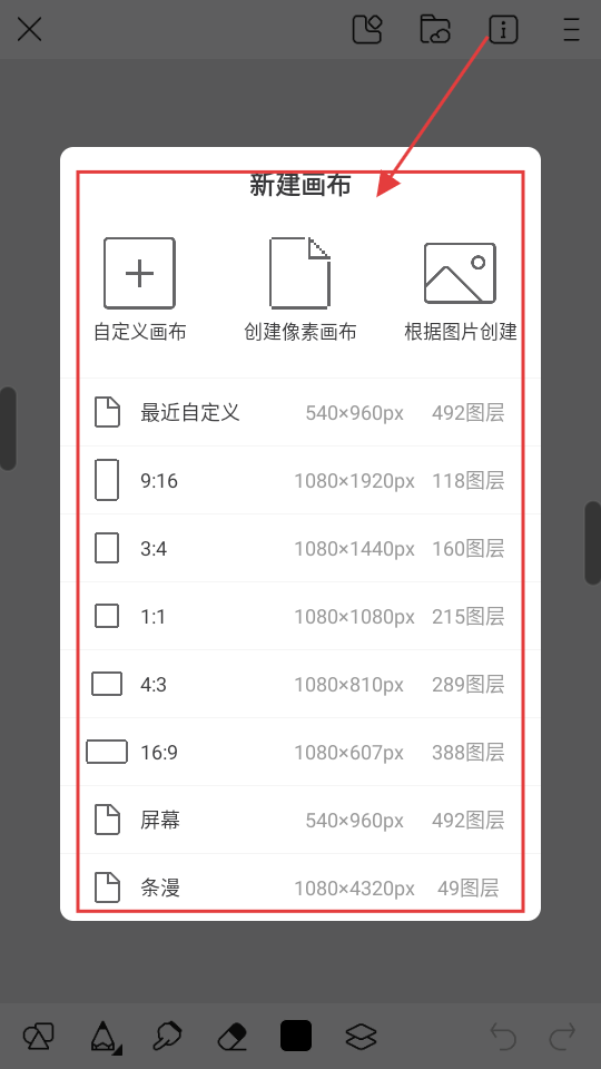 3、进入绘画页面,能看到新建画布的多种选项,像自定义画布、创建像素画布等,选合适的开始创作吧。