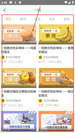 1、在首页,点顶部的【一招】选项,可进入对应的课程列表页面,查看各类绘画教学内容哦。