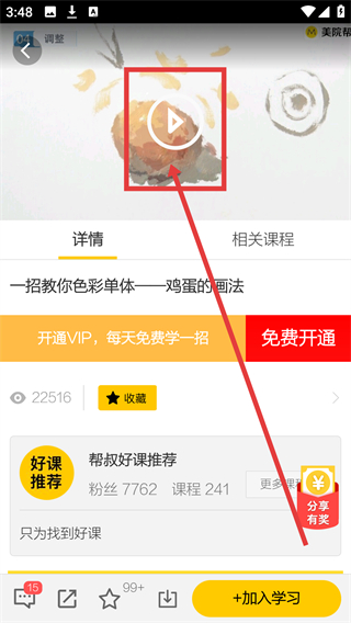 3、在课程详情页,点播放按钮就能开始观看教程,还能操作收藏或加入学习来跟进课程呢。
