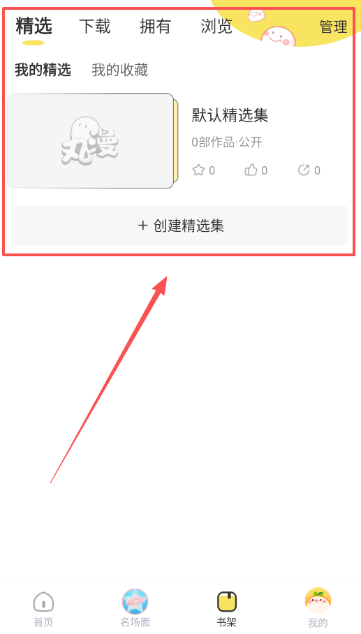 4、管理作品请使用“书架”功能,在“精选”标签下可以“创建精选集”来分类收藏你喜欢的漫画。